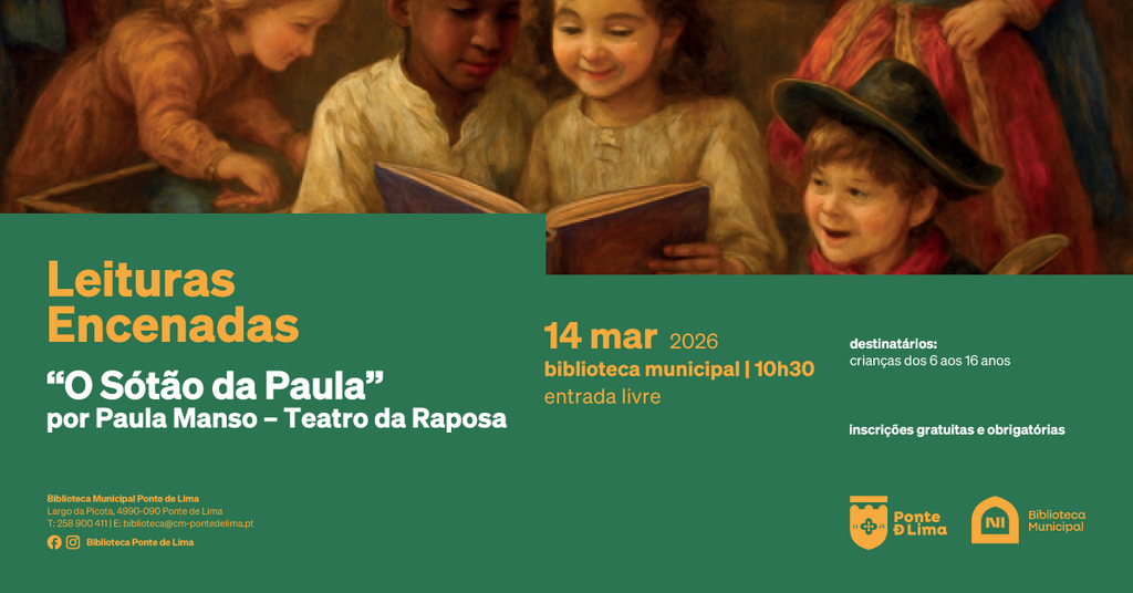 O Município de Ponte de Lima promove uma nova sessão do programa “Leituras Encenadas – O Sótão da Paula”, dirigida a crianças e jovens entre os 6 e os 16 anos. A atividade realiza-se no próximo dia 14 de março (sábado), pelas 10h30.