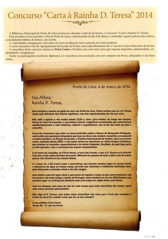 A Biblioteca Municipal de Ponte de Lima promoveu, durante o mês de fevereiro, o Concurso "Carta à Rainha D. Teresa".
