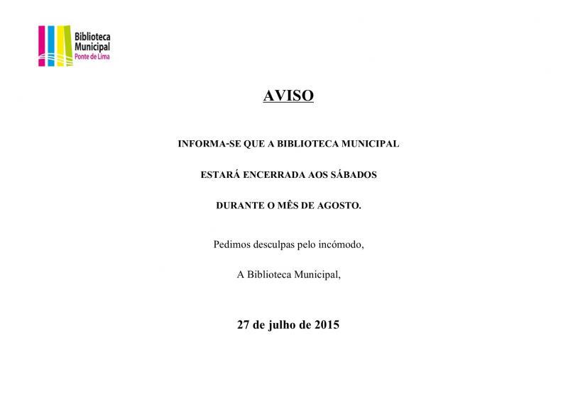 Informa-se que a Biblioteca Municipal de Ponte de Lima vai colocar em prática o horário de funcionamento de verão, encontrando-se encerrada aos sábados durante o mês de agosto.