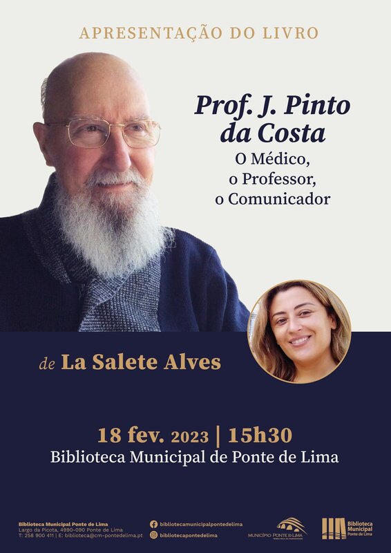 O livro "Prof. J. Pinto da Costa:O Médico, o Professor, o Comunicador", da autoria de La Salete Alves, vai ser apresentado na Biblioteca Municipal de Ponte de Lima, no próximo sábado, dia 18 de fevereiro de 2023, pelas 15h30.