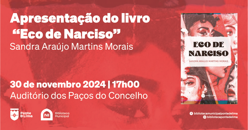 O Município de Ponte de Lima vai promover a sessão de apresentação do livro "Eco de Narciso", da autoria de Sandra Araújo Martins Morais, dia 30 de novembro, pelas 17h00, no auditório dos Paços do Concelho.