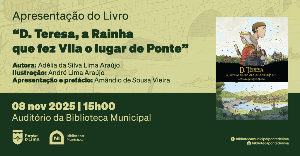 O Município de Ponte de Lima vai promover a sessão de apresentação do livro "D. Teresa, a Rainha que fez Vila o lugar de Ponte" da autoria de Adélia da Silva Lima Araújo, no dia 08 de novembro de 2025, pelas 15h00, no auditório a Biblioteca Municipal.
