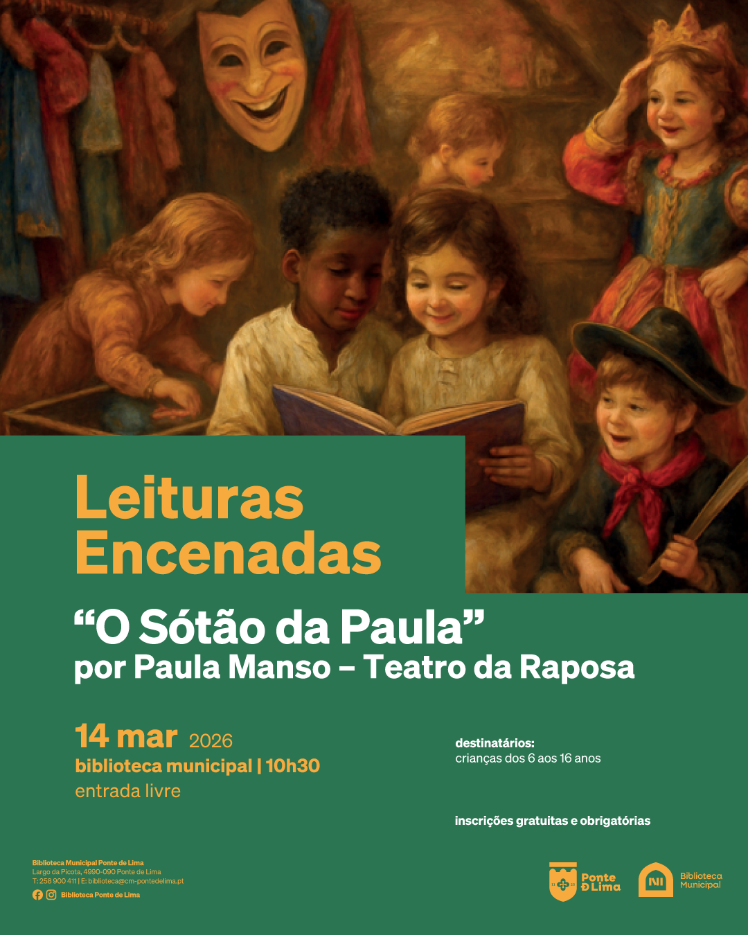 O Município de Ponte de Lima promove uma nova sessão do programa “Leituras Encenadas – O Sótão da Paula”, dirigida a crianças e jovens entre os 6 e os 16 anos. A atividade realiza-se no próximo dia 14 de março (sábado), pelas 10h30.