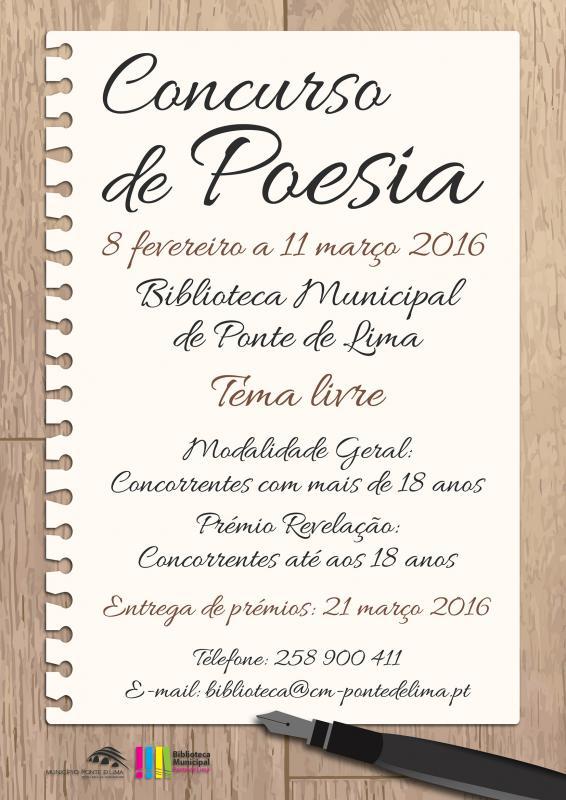 No âmbito das comemorações do Dia Mundial da Poesia, o Município de Ponte de Lima, através da Biblioteca Municipal, vai promover o Concurso de Poesia, destinado à galardoação de trabalhos literários inéditos e não publicados, cujo género literário elegível será, uma vez mais a poesia em língua portuguesa, este ano, de temática livre.