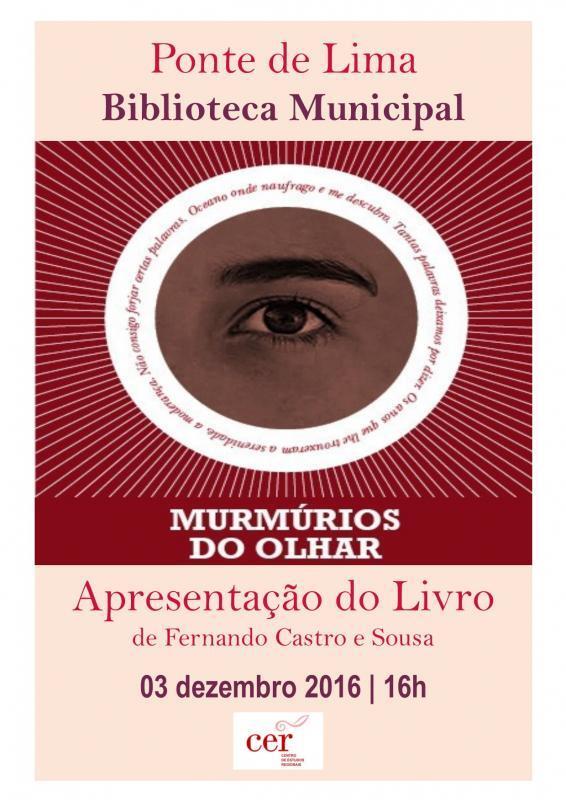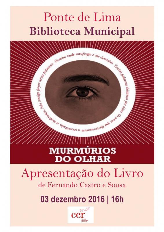 O Município de Ponte de Lima promove o lançamento da nova produção poética de Fernando Castro e Sousa - "Murmúrios do olhar" - no próximo dia 03 de dezembro, pelas 16h00, no Auditório da Biblioteca Municipal de Ponte de Lima.